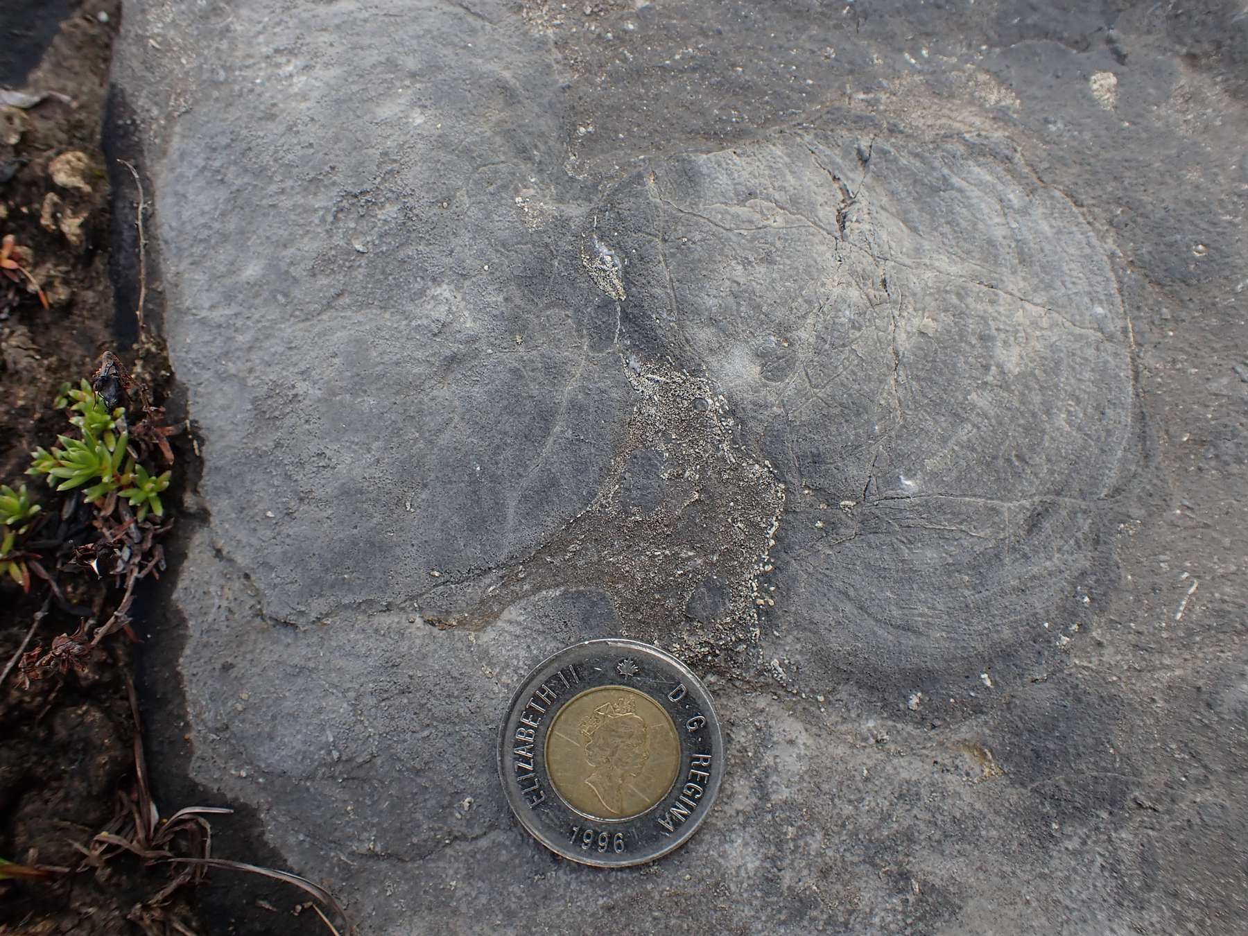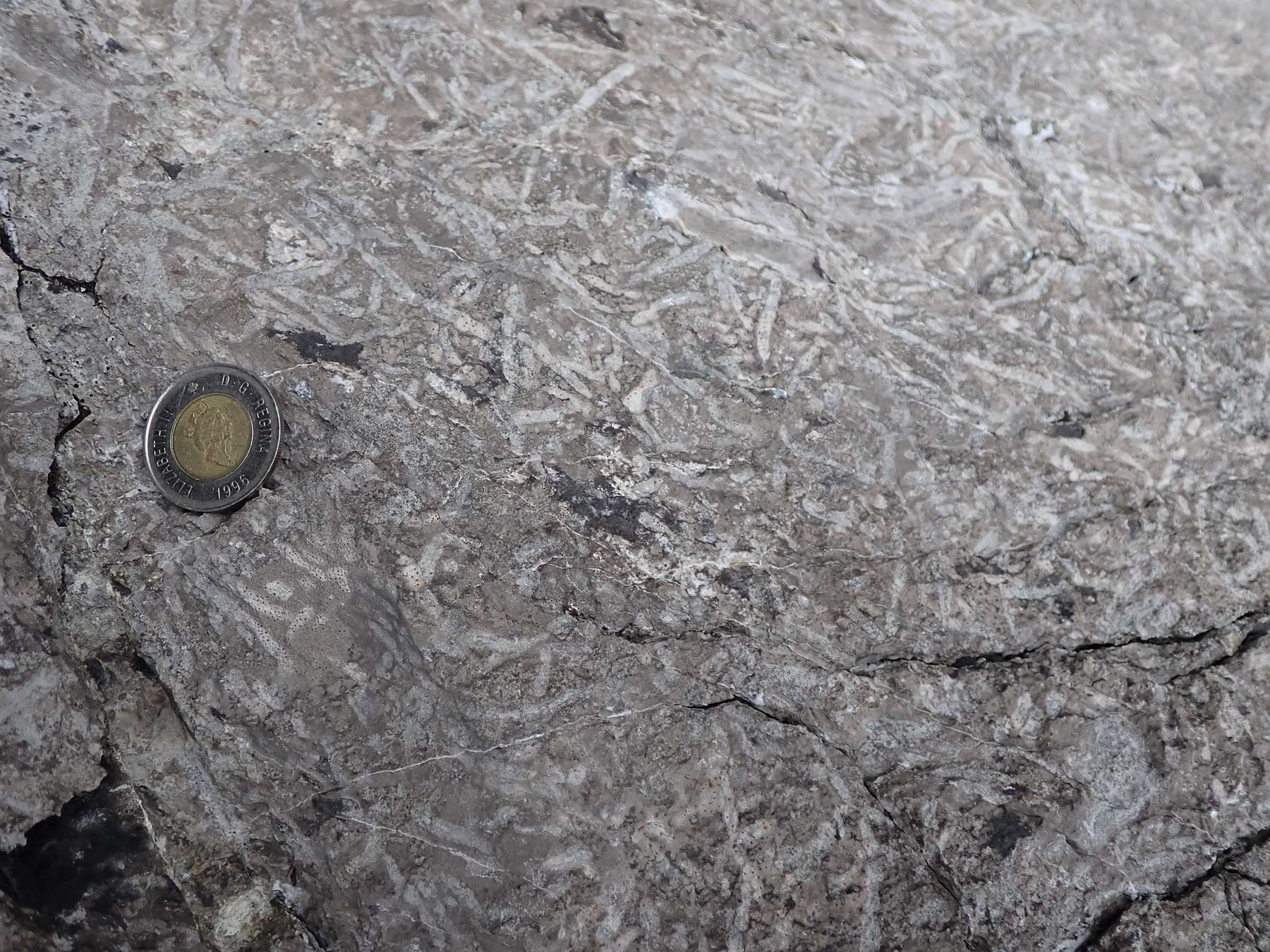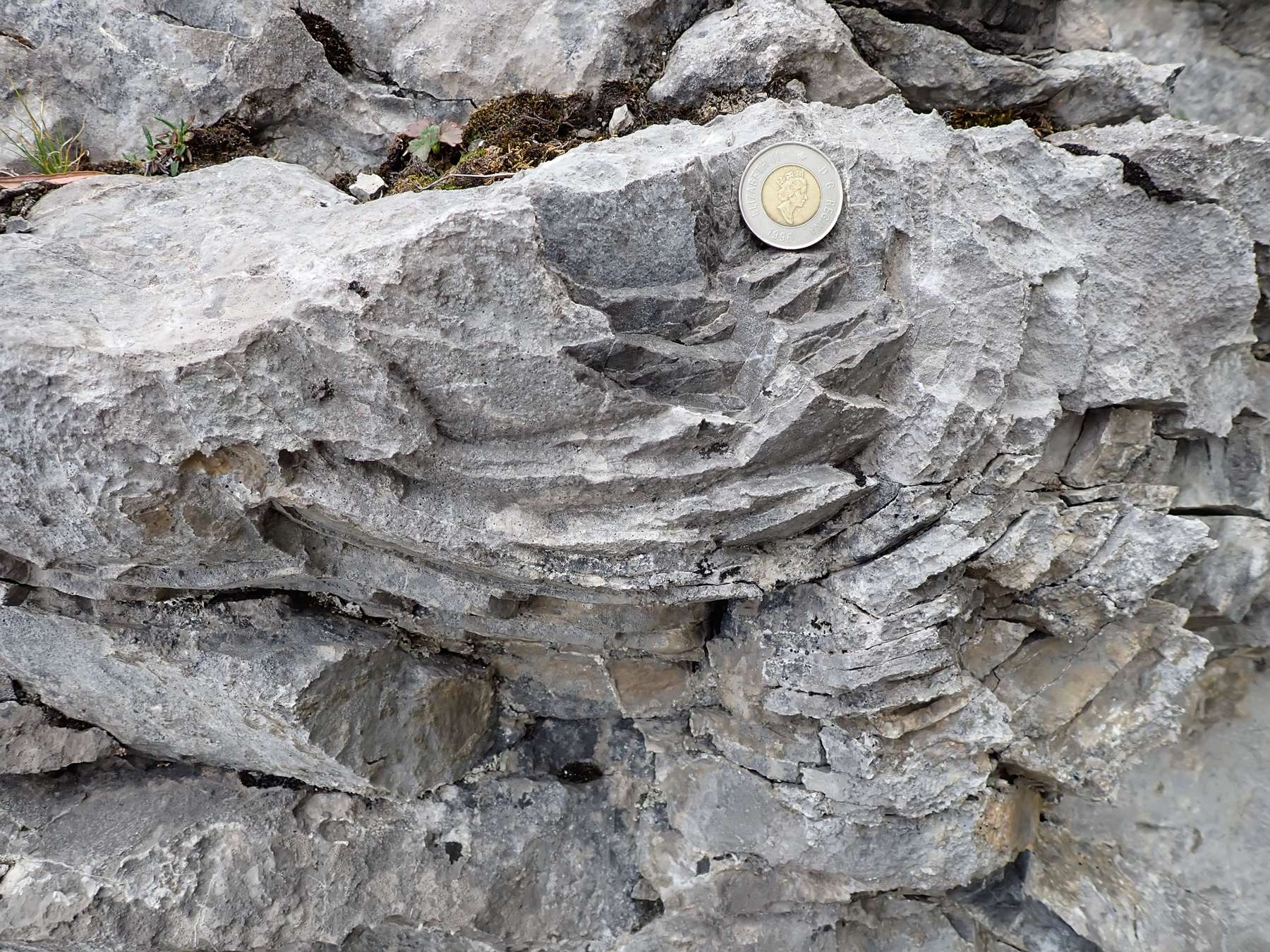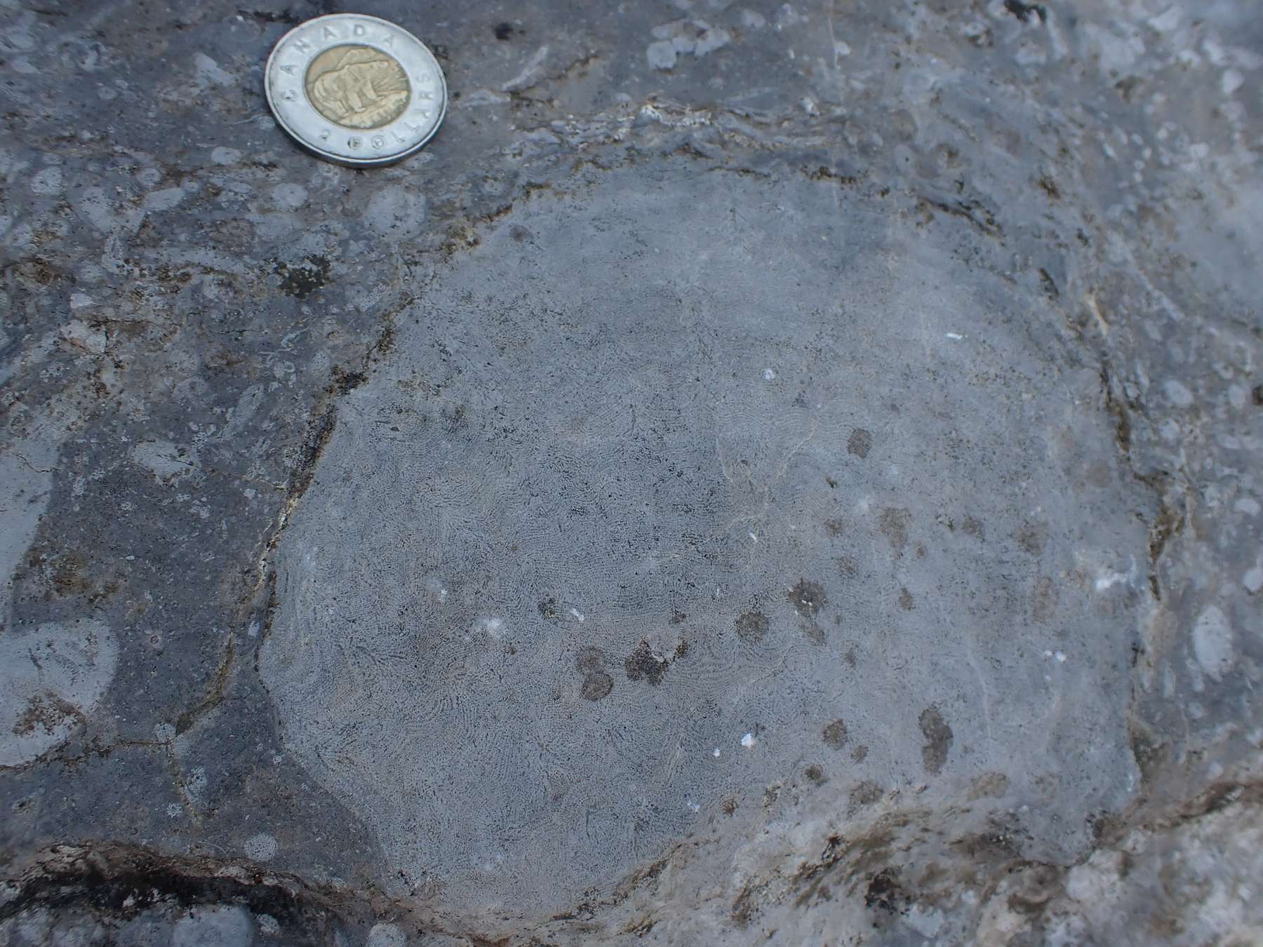 Large (40 cm diameter) stromatoporoid, Miette carbonate buildup, Jasper National Park