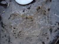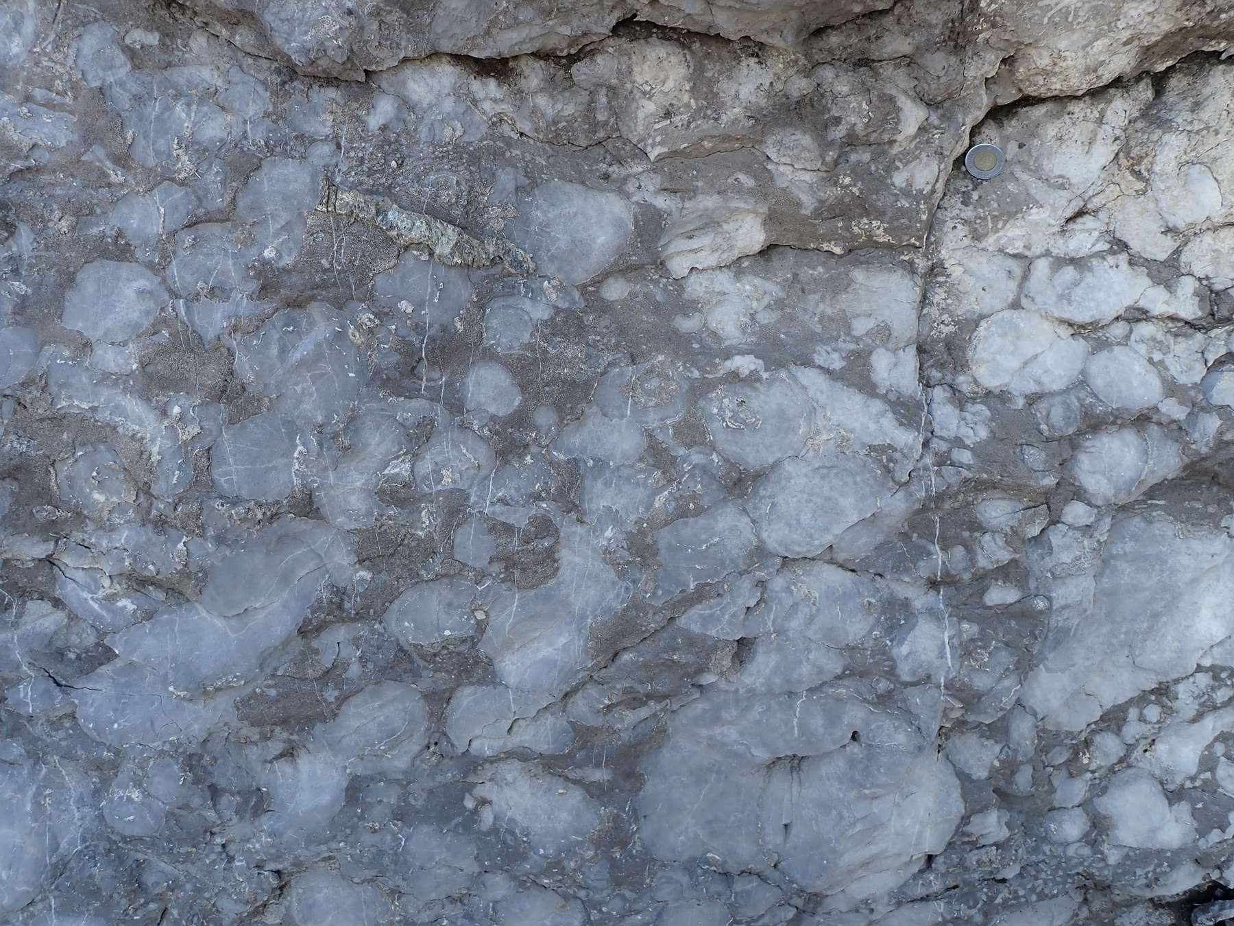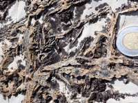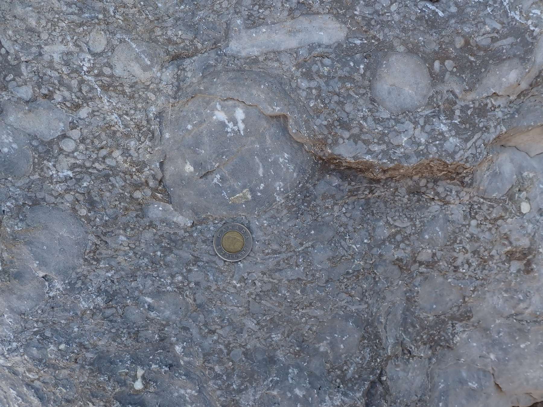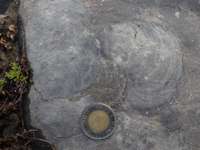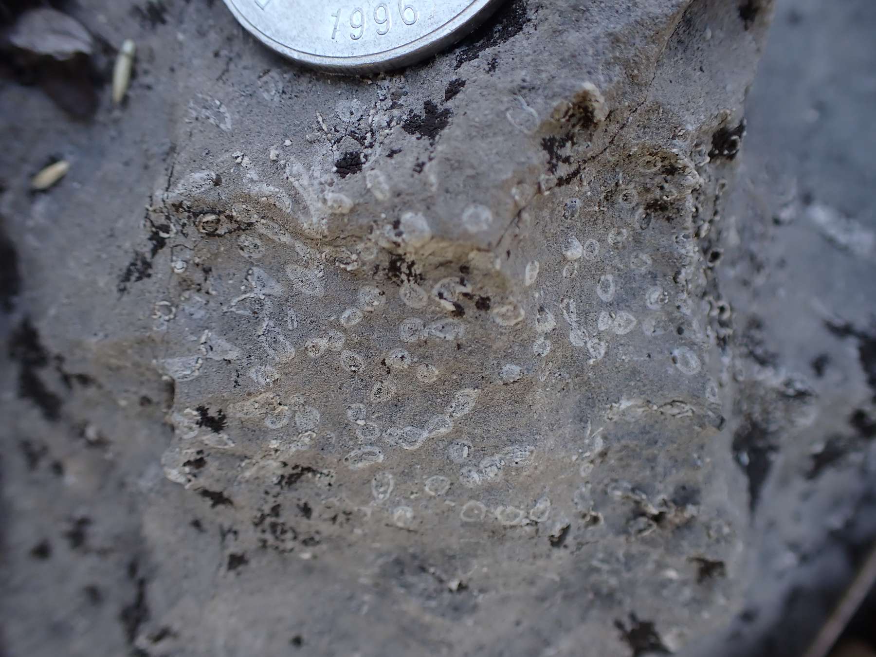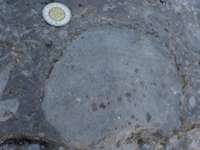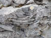 Large (40 cm diameter) stromatoporoid, Miette carbonate buildup, Jasper National Park