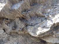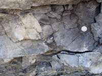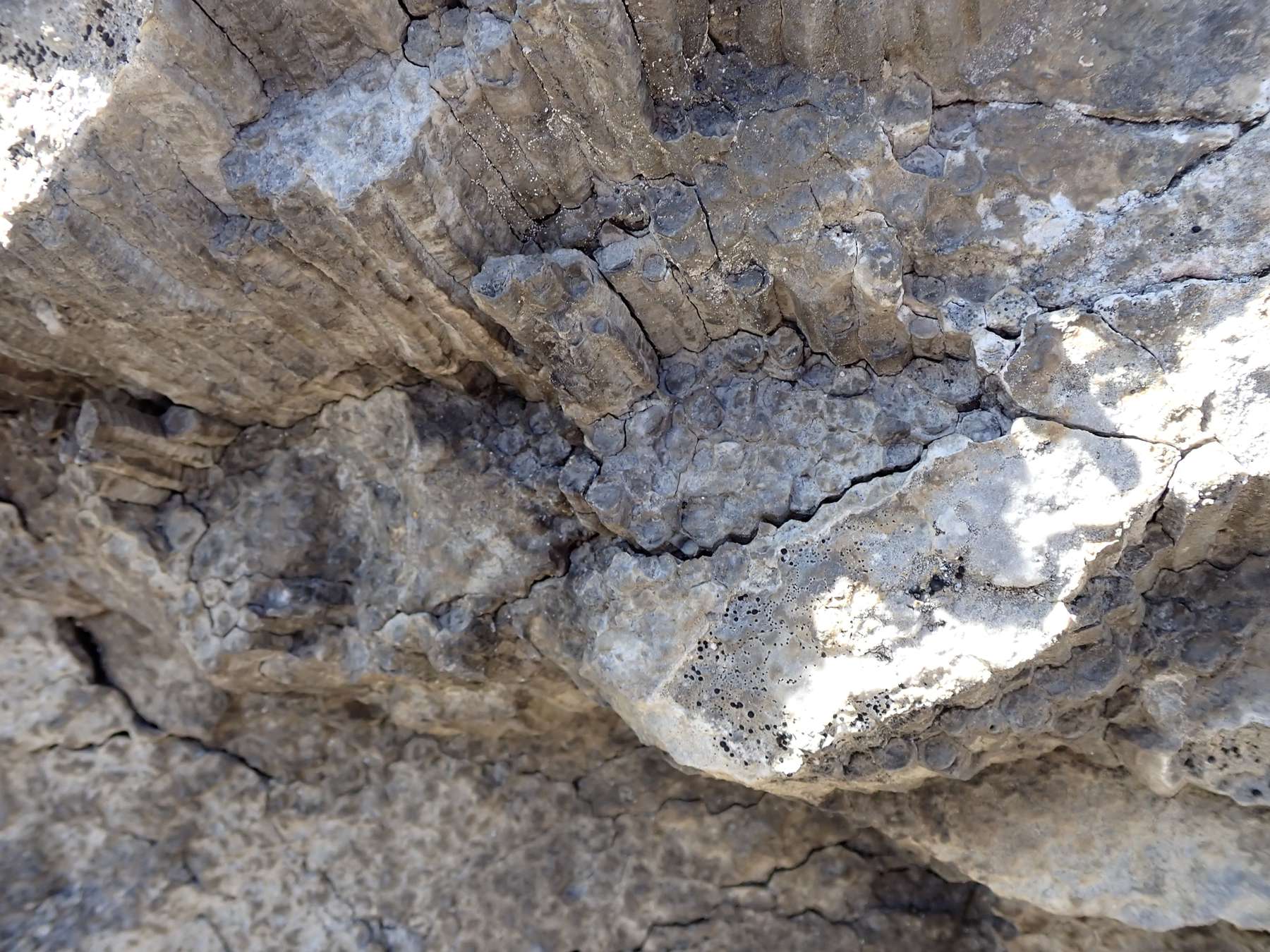 Large Mississippian 'honeycomb' tabulate coral (Lithostrotionella) in growth position. The coral is growing up and out, and then over topography (intersecting a pocket of wackestone).