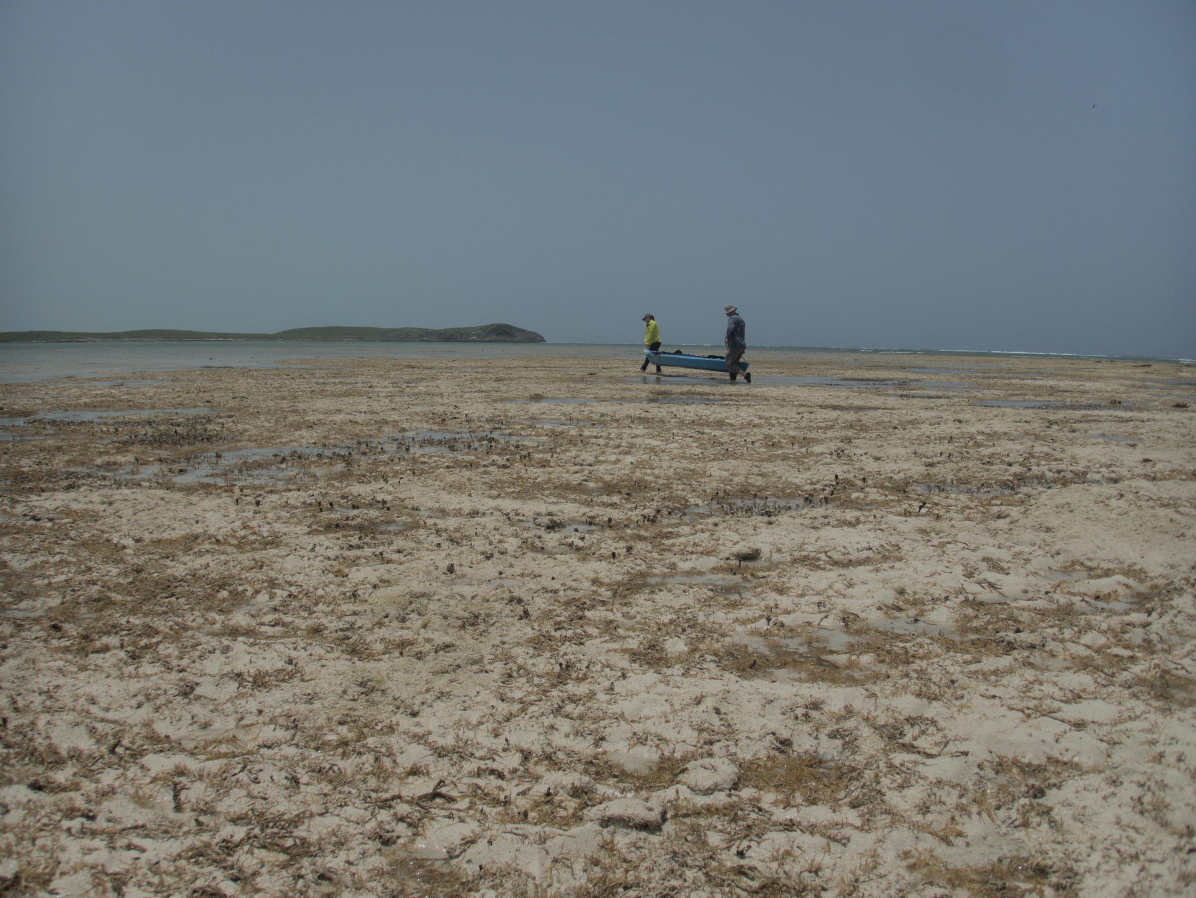 Billy and Oana carry their kayak across a carbonate hardground