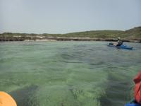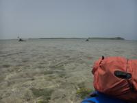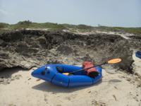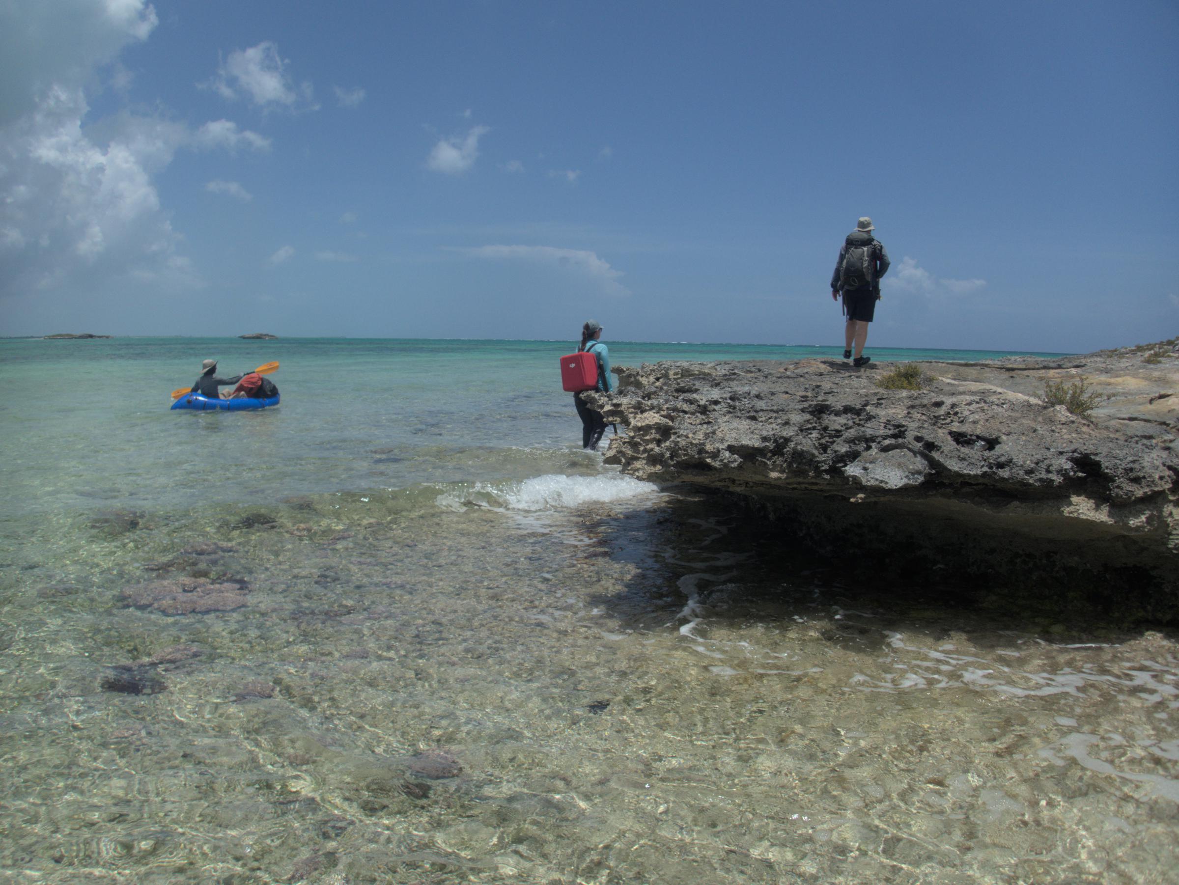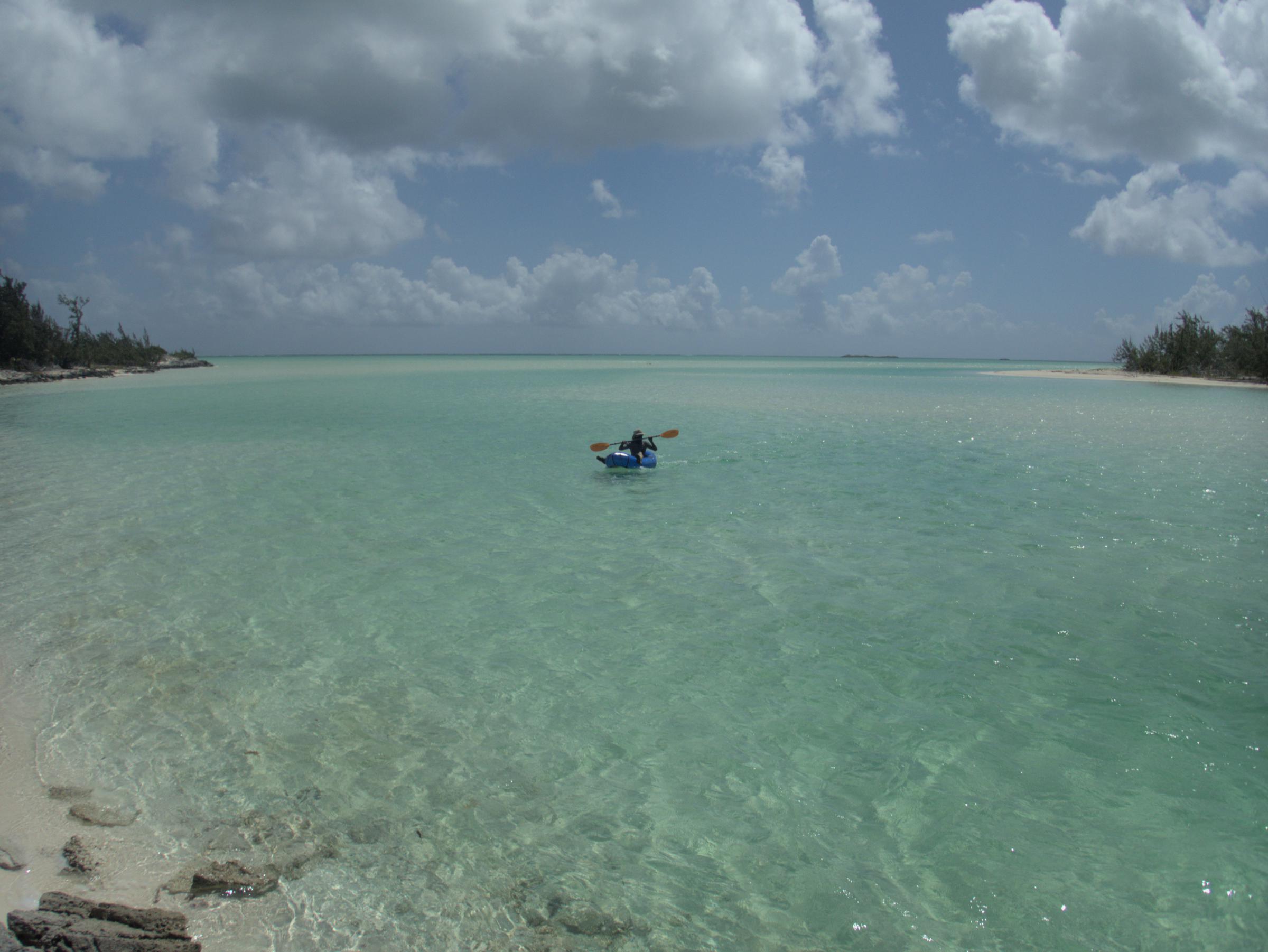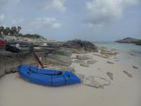 Roger bringing the packraft in to the beach on Joe Grant Cay