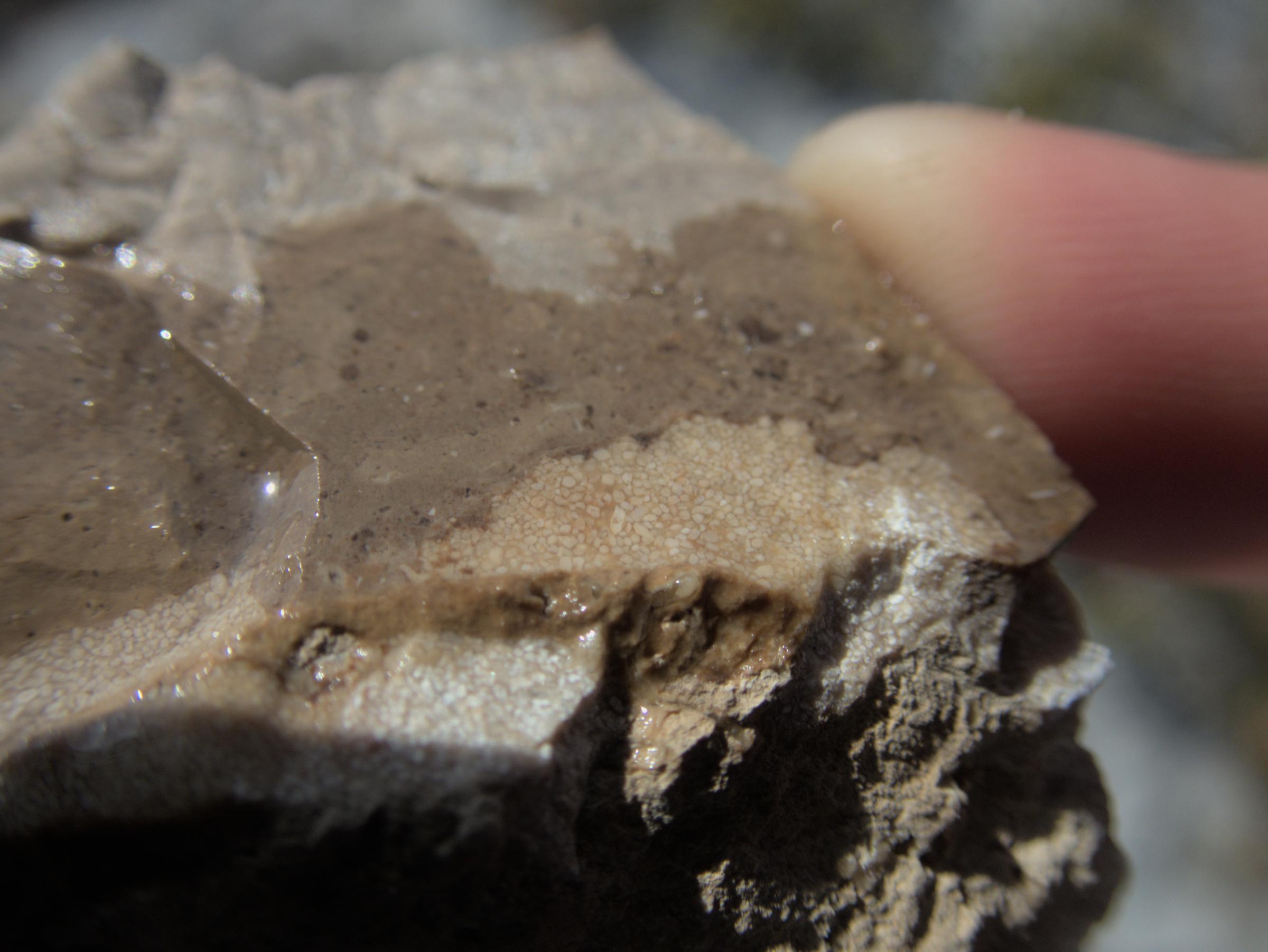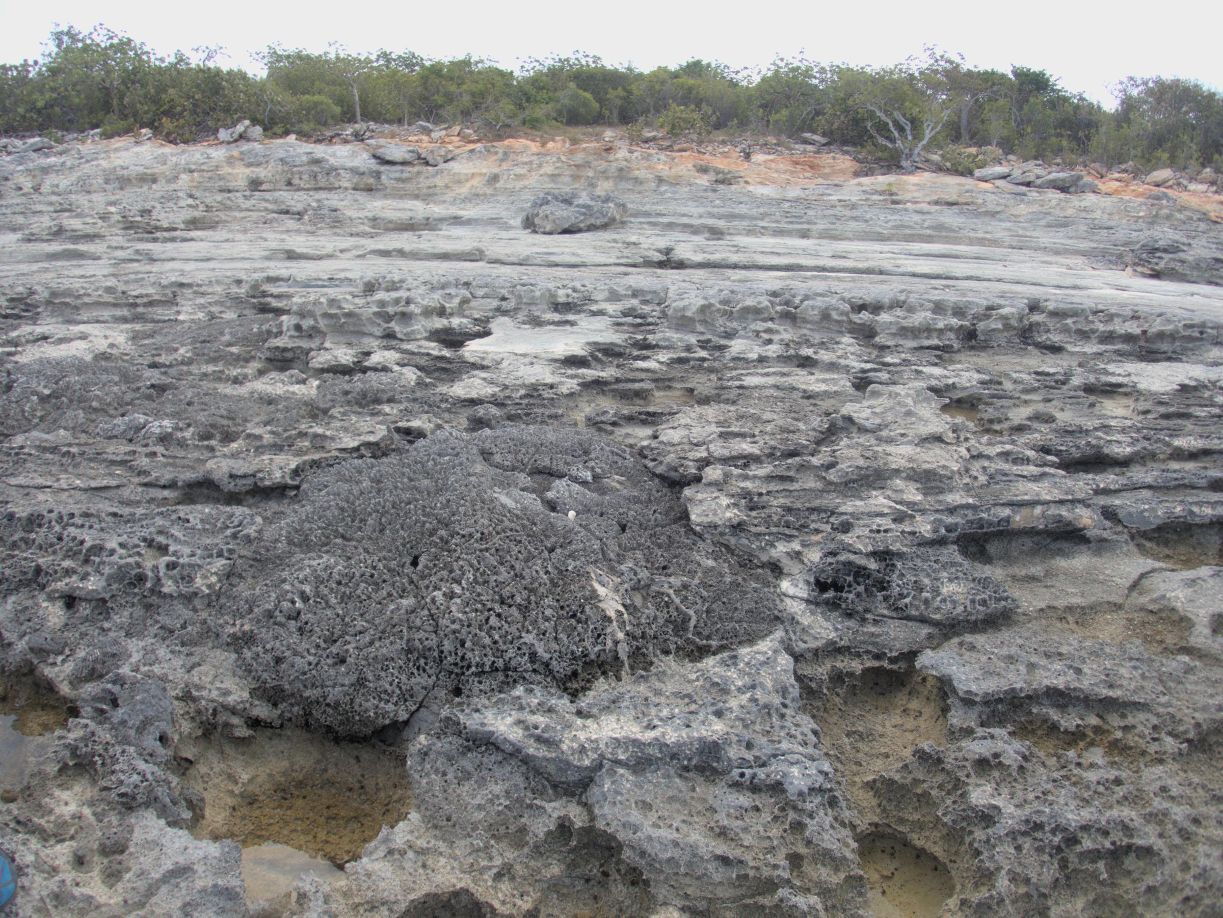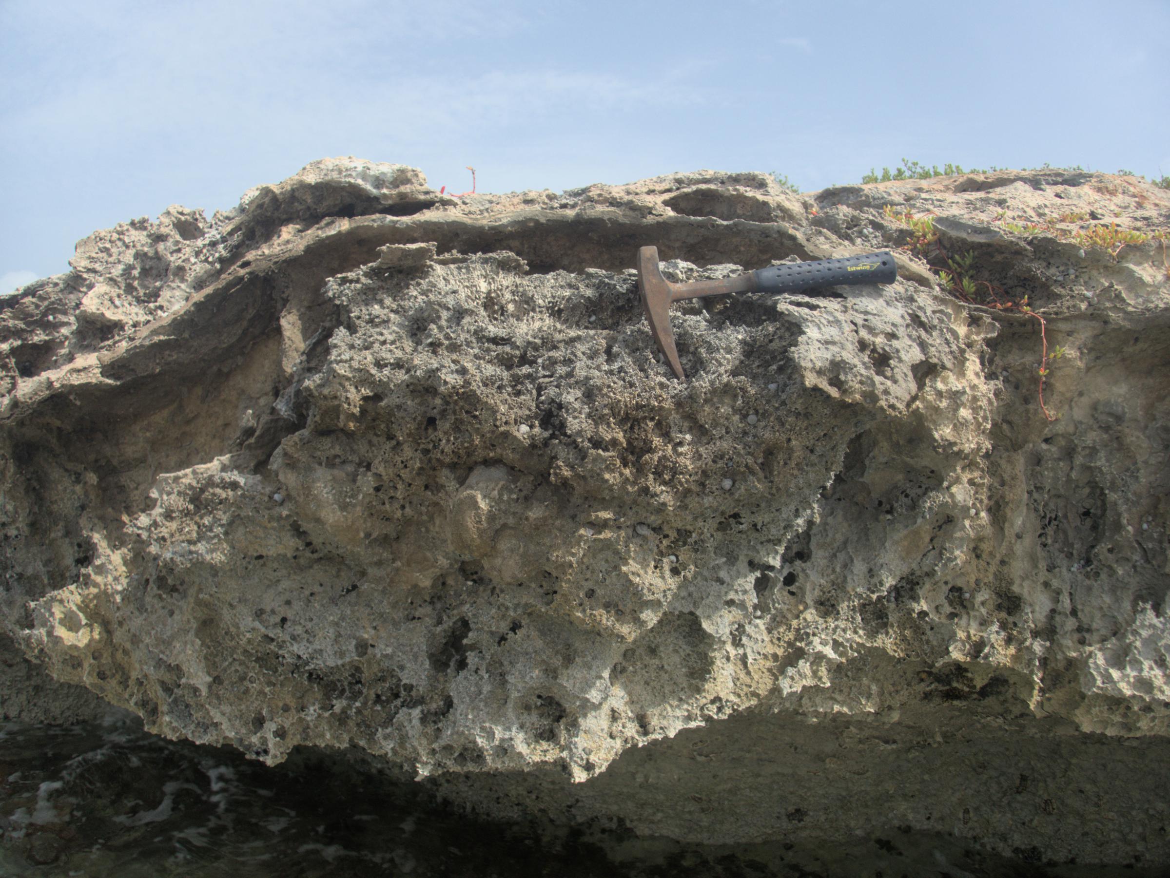 A fossilized red coralline algae sits atop fossil coral reef